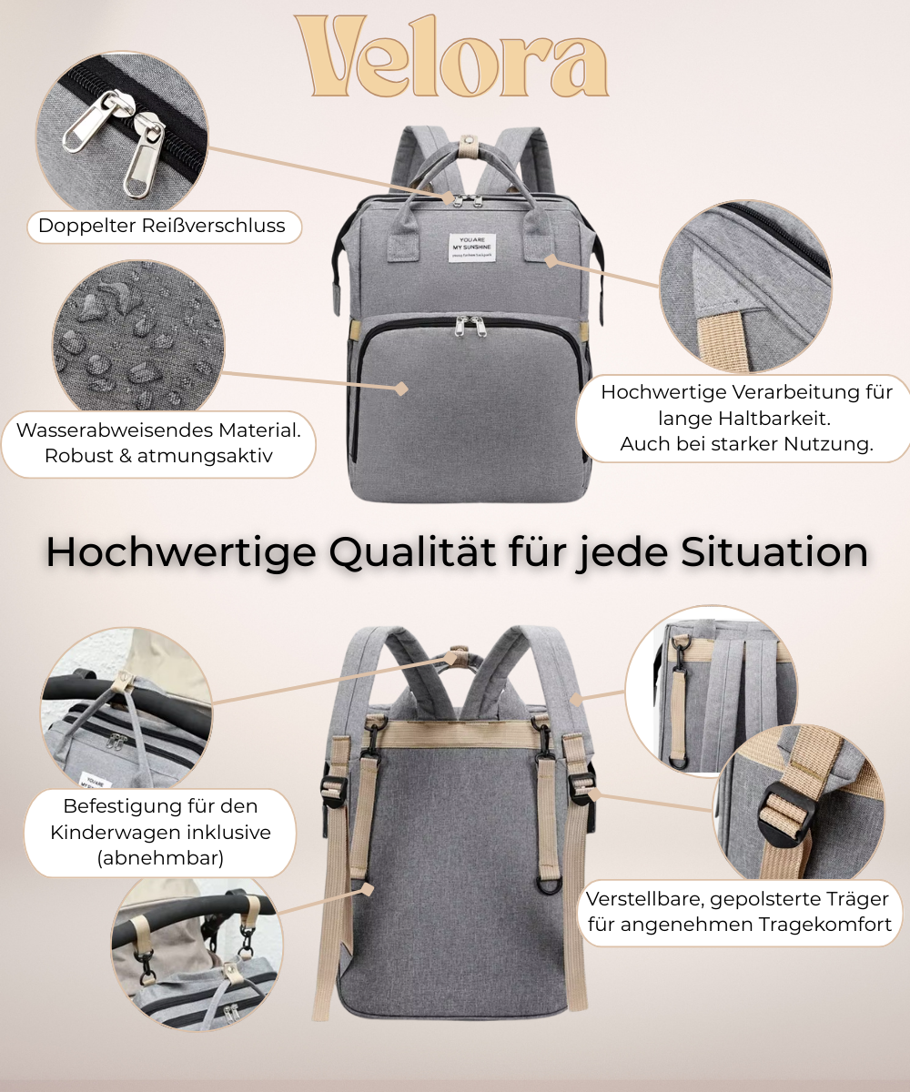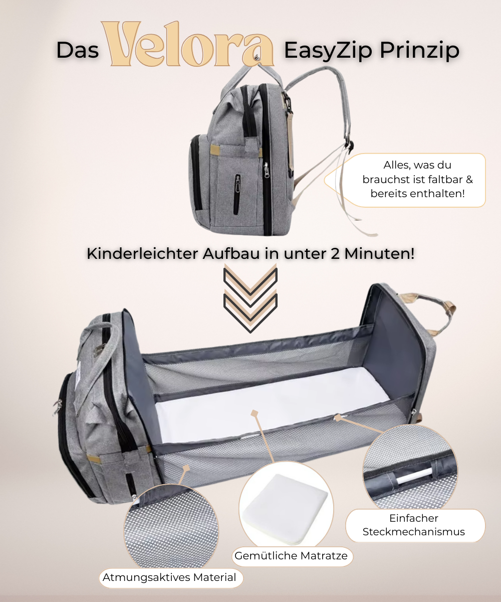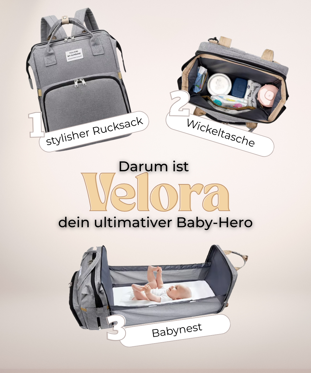Velora ist dein mobiler Alltagsretter: ein cleverer Rucksack, mit integriertem Babynest.