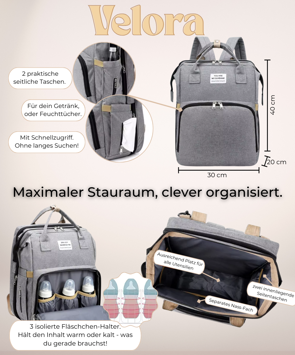 Alles dabei: Fläschchen, Windeln, Kleidung, Snacks & mehr. Clever organisiert & sofort griffbereit